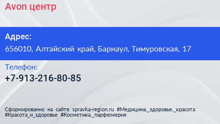 Avon, центр по адресу 656010, Алтайский край, Барнаул, Тимуровская, 17 в дальнейшем Организация, размещена в следующих категориях: