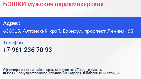 БОШКИ, мужская парикмахерская по адресу 656015, Алтайский край, Барнаул, проспект Ленина, 63 в дальнейшем Организация, размещена в следующих категориях:
