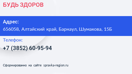 БУДЬ ЗДОРОВ по адресу 656058, Алтайский край, Барнаул, Шумакова, 15Б в дальнейшем Организация, размещена в следующих категориях: