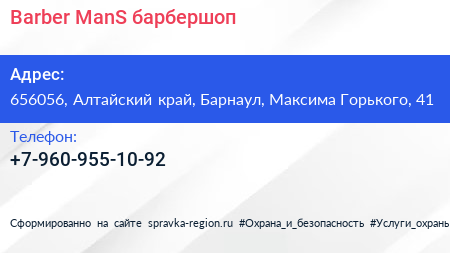 Barber ManS, барбершоп по адресу 656056, Алтайский край, Барнаул, Максима Горького, 41 в дальнейшем Организация, размещена в следующих категориях: