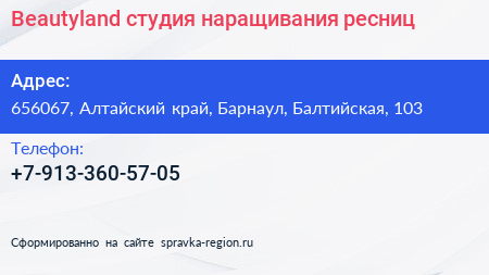 Beautyland, студия наращивания ресниц по адресу 656067, Алтайский край, Барнаул, Балтийская, 103 в дальнейшем Организация, размещена в следующих категориях: