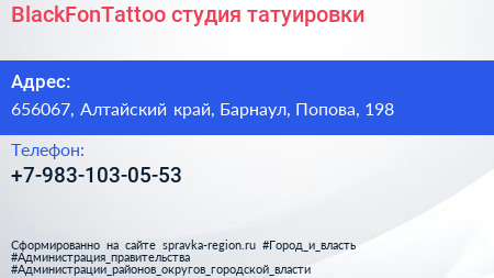 BlackFonTattoo, студия татуировки по адресу 656067, Алтайский край, Барнаул, Попова, 198 в дальнейшем Организация, размещена в следующих категориях: