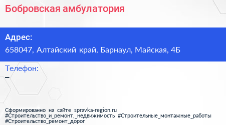 Бобровская амбулатория по адресу 658047, Алтайский край, Барнаул, Майская, 4Б в дальнейшем Организация, размещена в следующих категориях: