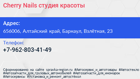 Cherry Nails, студия красоты по адресу 656006, Алтайский край, Барнаул, Взлётная, 23 в дальнейшем Организация, размещена в следующих категориях: