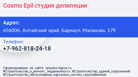 Cosmo Epil, студия депиляции по адресу 656006, Алтайский край, Барнаул, Малахова, 179 в дальнейшем Организация, размещена в следующих категориях: