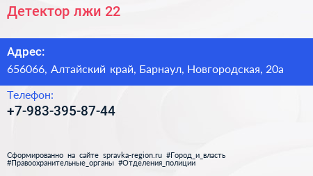 Детектор лжи 22 по адресу 656066, Алтайский край, Барнаул, Новгородская, 20а в дальнейшем Организация, размещена в следующих категориях: