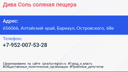 Дива Соль, соляная пещера по адресу 656066, Алтайский край, Барнаул, Островского, 68е в дальнейшем Организация, размещена в следующих категориях:
