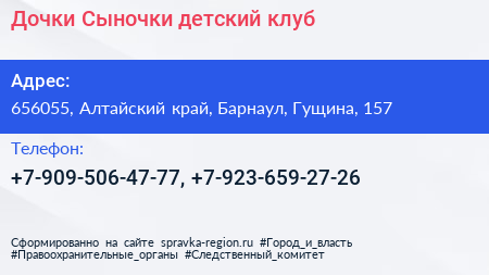 Дочки-Сыночки, детский клуб по адресу 656055, Алтайский край, Барнаул, Гущина, 157 в дальнейшем Организация, размещена в следующих категориях: