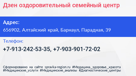 Дзен, оздоровительный семейный центр по адресу 656902, Алтайский край, Барнаул, Парадная, 39 в дальнейшем Организация, размещена в следующих категориях: