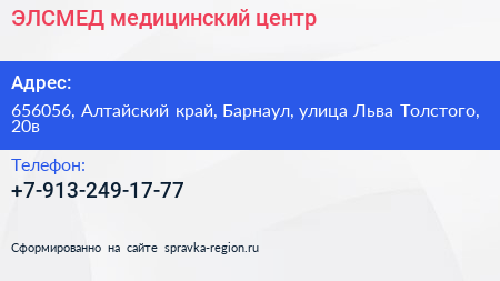 ЭЛСМЕД, медицинский центр по адресу 656056, Алтайский край, Барнаул, улица Льва Толстого, 20в в дальнейшем Организация, размещена в следующих категориях: