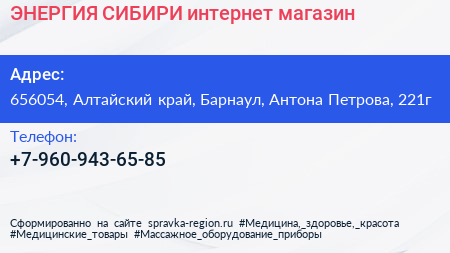 ЭНЕРГИЯ СИБИРИ, интернет-магазин по адресу 656054, Алтайский край, Барнаул, Антона Петрова, 221г в дальнейшем Организация, размещена в следующих категориях: