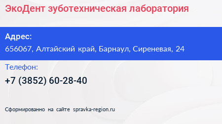 ЭкоДент, зуботехническая лаборатория по адресу 656067, Алтайский край, Барнаул, Сиреневая, 24 в дальнейшем Организация, размещена в следующих категориях: