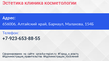 Эстетика, клиника косметологии по адресу 656006, Алтайский край, Барнаул, Малахова, 154Б в дальнейшем Организация, размещена в следующих категориях:
