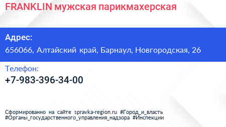 FRANKLIN, мужская парикмахерская по адресу 656066, Алтайский край, Барнаул, Новгородская, 26 в дальнейшем Организация, размещена в следующих категориях:
