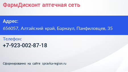 ФармДисконт, аптечная сеть по адресу 656057, Алтайский край, Барнаул, Панфиловцев, 35 в дальнейшем Организация, размещена в следующих категориях: