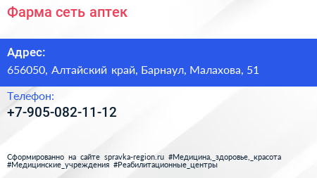 Фарма, сеть аптек по адресу 656050, Алтайский край, Барнаул, Малахова, 51 в дальнейшем Организация, размещена в следующих категориях: