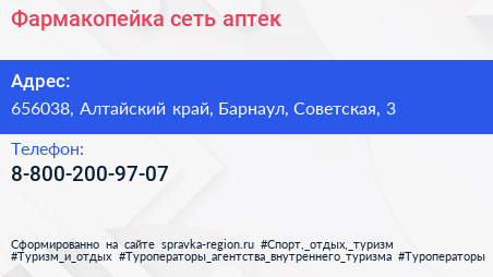Фармакопейка, сеть аптек по адресу 656038, Алтайский край, Барнаул, Советская, 3 в дальнейшем Организация, размещена в следующих категориях: