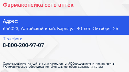 Фармакопейка, сеть аптек по адресу 656023, Алтайский край, Барнаул, 40 лет Октября, 26 в дальнейшем Организация, размещена в следующих категориях: