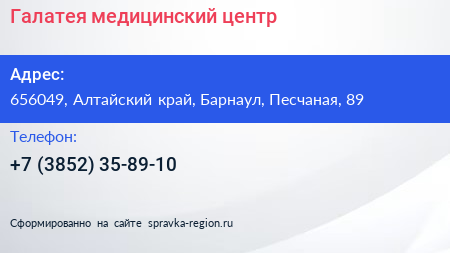 Галатея, медицинский центр по адресу 656049, Алтайский край, Барнаул, Песчаная, 89 в дальнейшем Организация, размещена в следующих категориях: