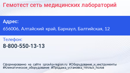 Гемотест, сеть медицинских лабораторий по адресу 656006, Алтайский край, Барнаул, Балтийская, 12 в дальнейшем Организация, размещена в следующих категориях: