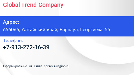 Global Trend Company по адресу 656066, Алтайский край, Барнаул, Георгиева, 55 в дальнейшем Организация, размещена в следующих категориях: