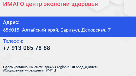 ИМАГО, центр экологии здоровья по адресу 656015, Алтайский край, Барнаул, Деповская, 7 в дальнейшем Организация, размещена в следующих категориях: