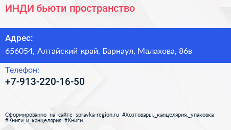 ИНДИ, бьюти-пространство по адресу 656054, Алтайский край, Барнаул, Малахова, 86в в дальнейшем Организация, размещена в следующих категориях:
