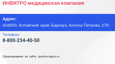 ИНВИТРО, медицинская компания по адресу 656050, Алтайский край, Барнаул, Антона Петрова, 170 в дальнейшем Организация, размещена в следующих категориях: