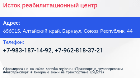 Исток, реабилитационный центр по адресу 656015, Алтайский край, Барнаул, Союза Республик, 44 в дальнейшем Организация, размещена в следующих категориях: