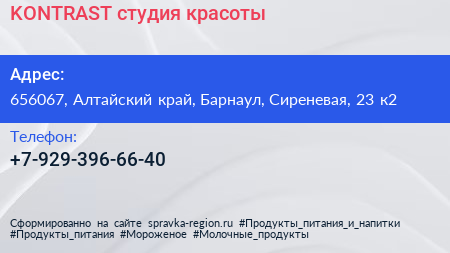 KONTRAST, студия красоты по адресу 656067, Алтайский край, Барнаул, Сиреневая, 23 к2 в дальнейшем Организация, размещена в следующих категориях: