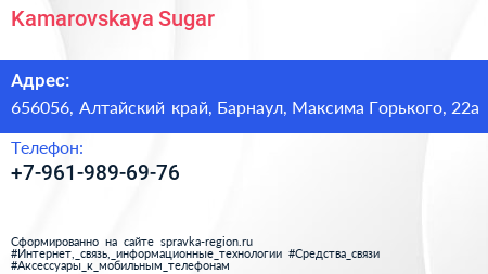 Kamarovskaya Sugar по адресу 656056, Алтайский край, Барнаул, Максима Горького, 22а в дальнейшем Организация, размещена в следующих категориях: