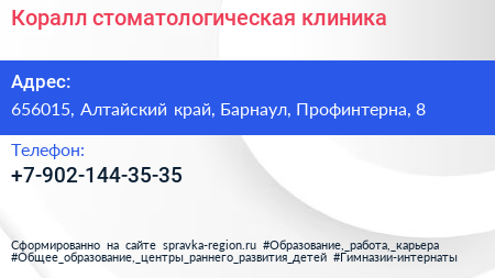 Коралл, стоматологическая клиника по адресу 656015, Алтайский край, Барнаул, Профинтерна, 8 в дальнейшем Организация, размещена в следующих категориях: