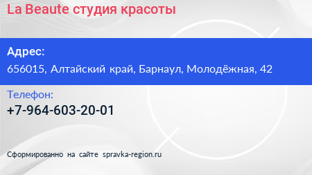 La Beaute`, студия красоты по адресу 656015, Алтайский край, Барнаул, Молодёжная, 42 в дальнейшем Организация, размещена в следующих категориях: