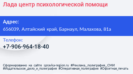 Лада, центр психологической помощи по адресу 656039, Алтайский край, Барнаул, Малахова, 81а в дальнейшем Организация, размещена в следующих категориях: