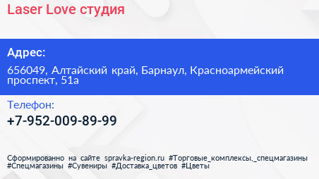 Laser Love, студия по адресу 656049, Алтайский край, Барнаул, Красноармейский проспект, 51а в дальнейшем Организация, размещена в следующих категориях: