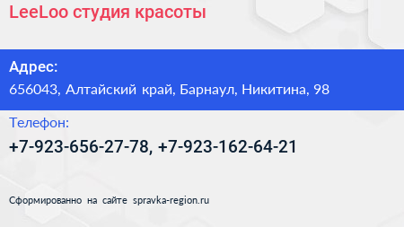 LeeLoo, студия красоты по адресу 656043, Алтайский край, Барнаул, Никитина, 98 в дальнейшем Организация, размещена в следующих категориях: