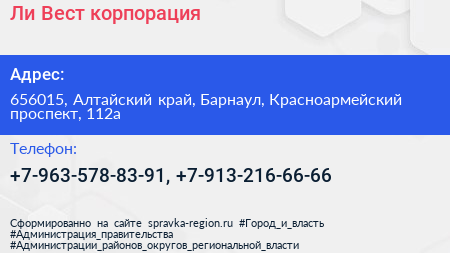 Ли Вест, корпорация по адресу 656015, Алтайский край, Барнаул, Красноармейский проспект, 112а в дальнейшем Организация, размещена в следующих категориях:
