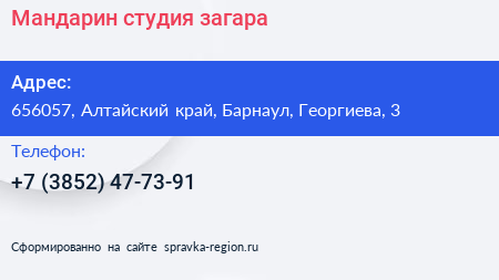 Мандарин, студия загара по адресу 656057, Алтайский край, Барнаул, Георгиева, 3 в дальнейшем Организация, размещена в следующих категориях: