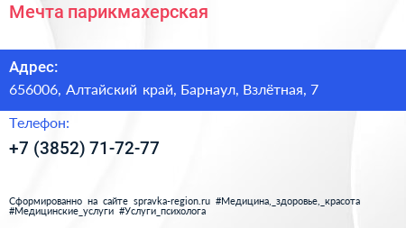 Мечта, парикмахерская по адресу 656006, Алтайский край, Барнаул, Взлётная, 7 в дальнейшем Организация, размещена в следующих категориях: