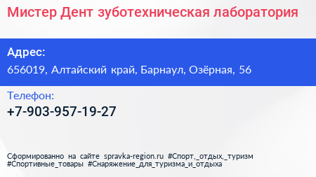 Мистер Дент, зуботехническая лаборатория по адресу 656019, Алтайский край, Барнаул, Озёрная, 56 в дальнейшем Организация, размещена в следующих категориях: