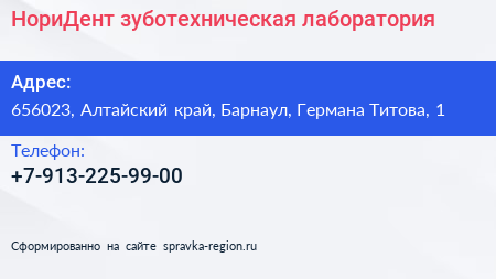 НориДент, зуботехническая лаборатория по адресу 656023, Алтайский край, Барнаул, Германа Титова, 1 в дальнейшем Организация, размещена в следующих категориях:
