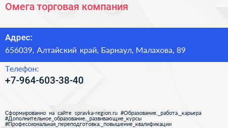 Омега, торговая компания по адресу 656039, Алтайский край, Барнаул, Малахова, 89 в дальнейшем Организация, размещена в следующих категориях: