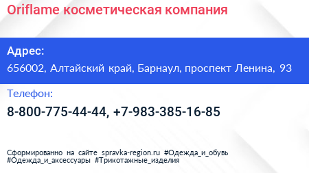 Oriflame, косметическая компания по адресу 656002, Алтайский край, Барнаул, проспект Ленина, 93 в дальнейшем Организация, размещена в следующих категориях: