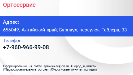 Ортосервис по адресу 656049, Алтайский край, Барнаул, переулок Геблера, 33 в дальнейшем Организация, размещена в следующих категориях: