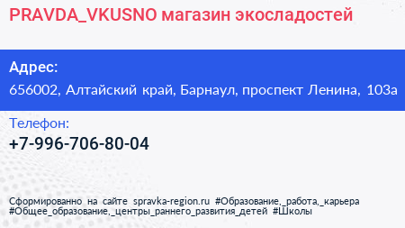 PRAVDA_VKUSNO, магазин экосладостей по адресу 656002, Алтайский край, Барнаул, проспект Ленина, 103а в дальнейшем Организация, размещена в следующих категориях: