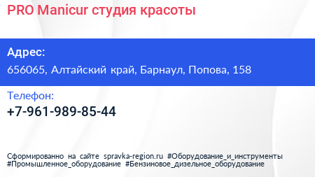 PRO Manicur, студия красоты по адресу 656065, Алтайский край, Барнаул, Попова, 158 в дальнейшем Организация, размещена в следующих категориях: