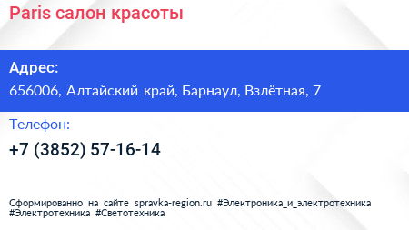 Paris, салон красоты по адресу 656006, Алтайский край, Барнаул, Взлётная, 7 в дальнейшем Организация, размещена в следующих категориях: