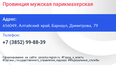 Провинция, мужская парикмахерская по адресу 656049, Алтайский край, Барнаул, Димитрова, 79 в дальнейшем Организация, размещена в следующих категориях: