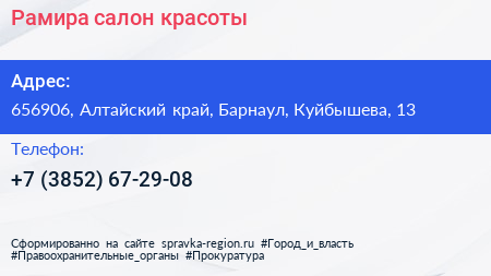 Рамира, салон красоты по адресу 656906, Алтайский край, Барнаул, Куйбышева, 13 в дальнейшем Организация, размещена в следующих категориях: