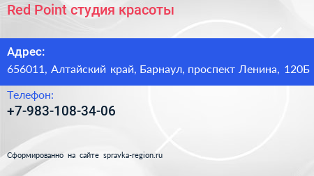 Red Point, студия красоты по адресу 656011, Алтайский край, Барнаул, проспект Ленина, 120Б в дальнейшем Организация, размещена в следующих категориях: